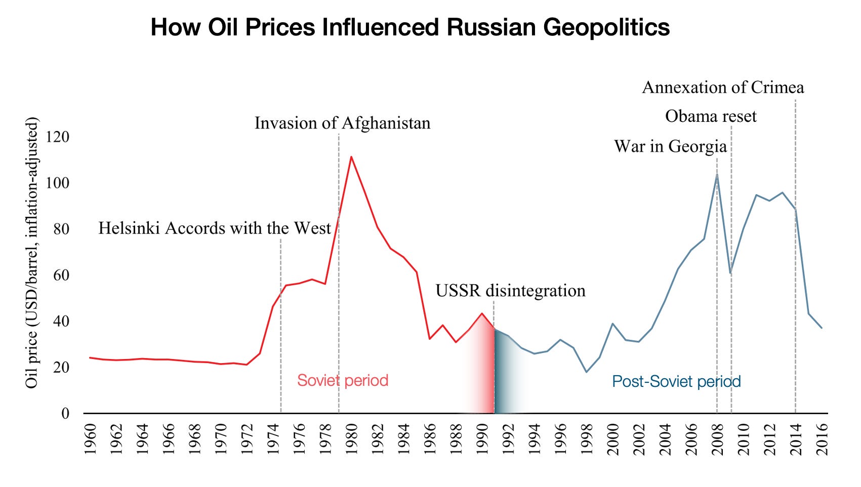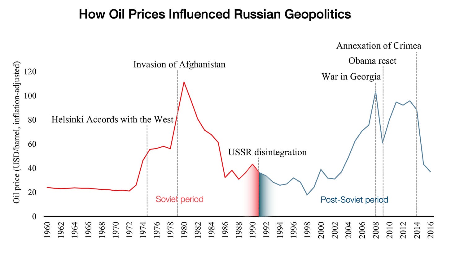 Russia (the USSR) invaded Afghanistan when oil prices were high, it became a failed state when prices shrank, Putin could only consolidate power when oil prices started growing again, and he went to war with Georgia and annexed Crimea when they were highest.
