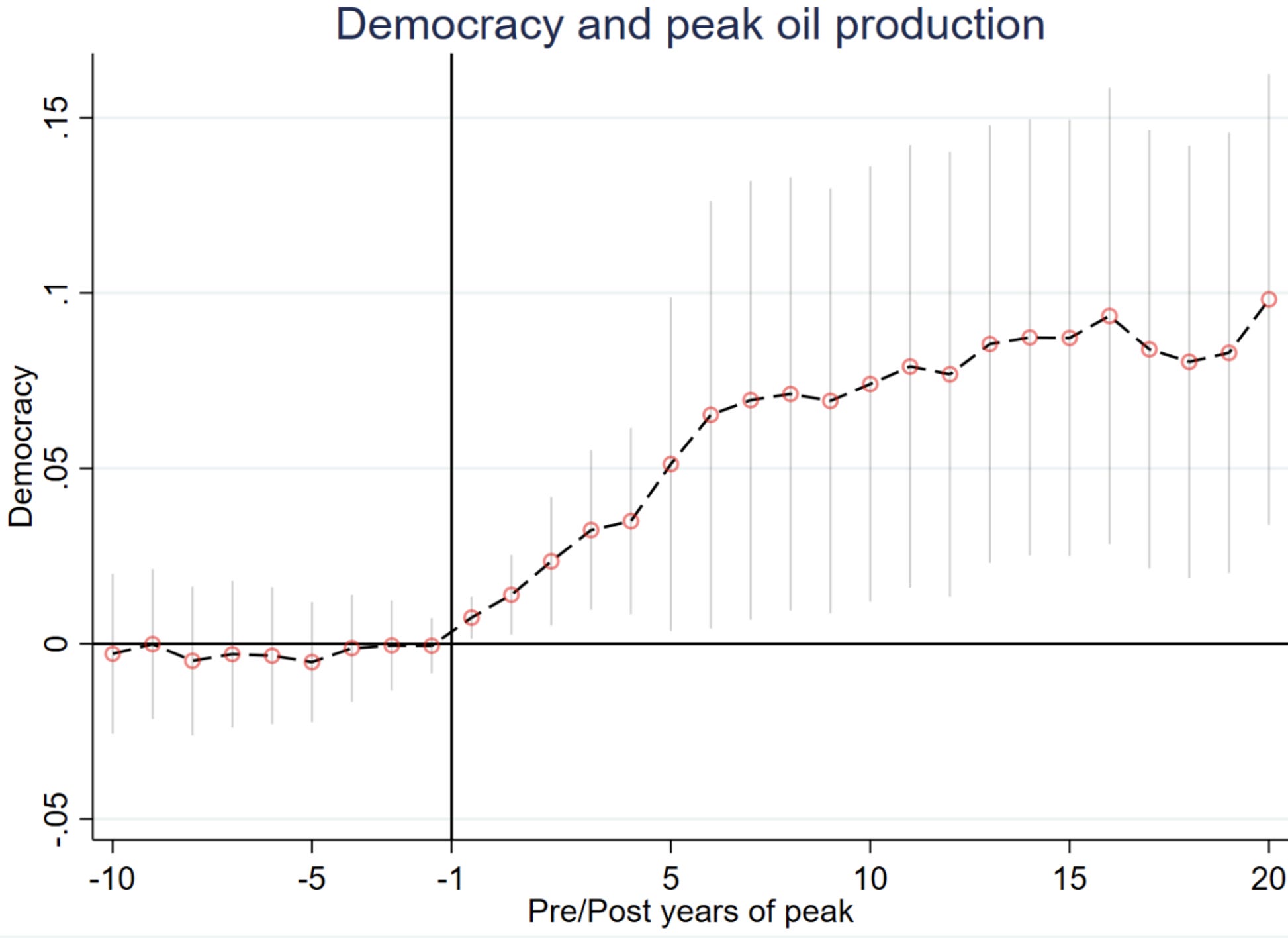 It does look like countries tend to move towards democracy after they reach their peak oil production: