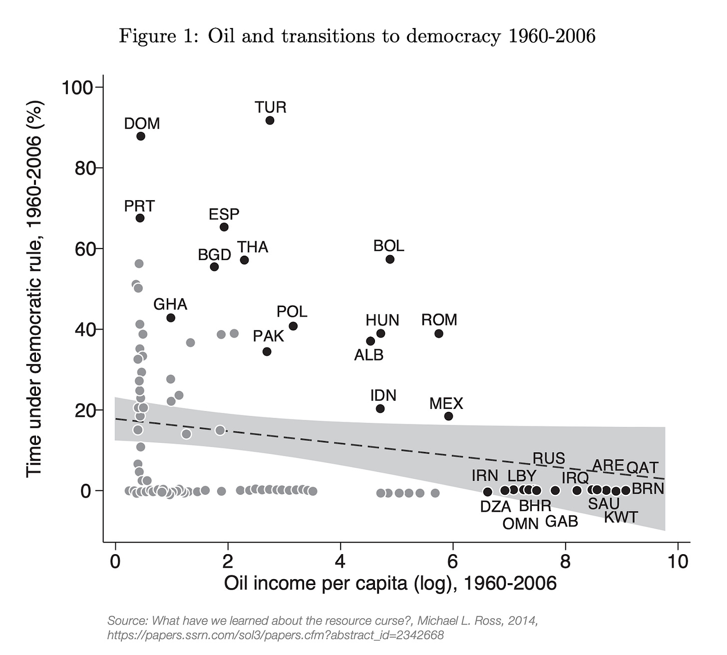 But in many countries, this transition won’t happen. So far, no country with as much oil wealth as Libya or Iraq, or even with half as much oil wealth as those, has ever made a successful transition to democracy.