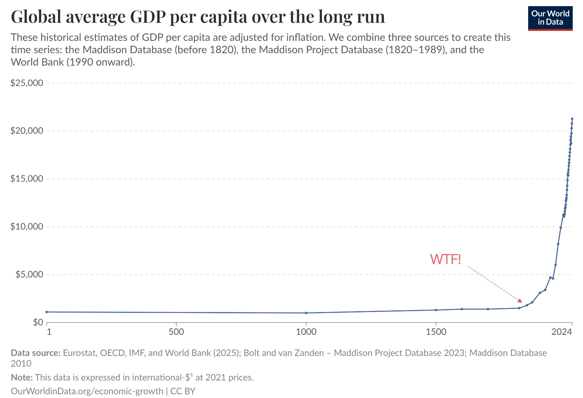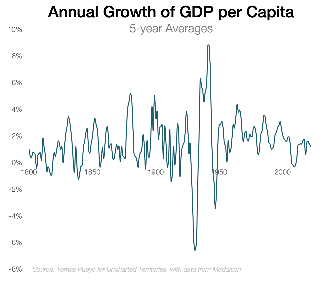 Also, if you told somebody in 1700 that some economies would start growing at 2% per year per capita for the following 250 years, they would have laughed. And yet…