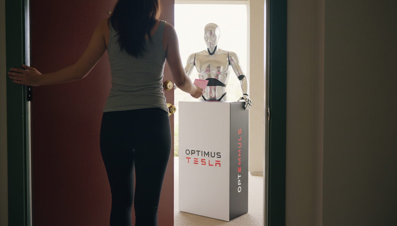 Alice opens the door. The android delivers two packages: One has the words Optimus and Tesla emblazoned on a huge box. The other is a pink slip.