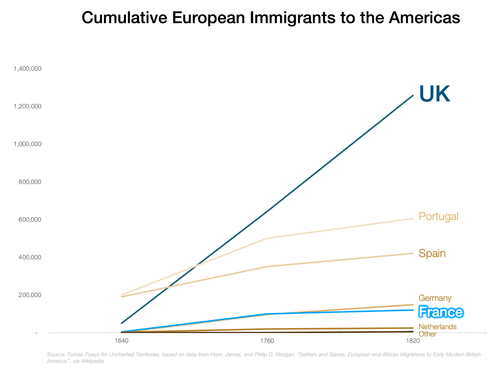 You might have noticed that I said France sent ~15k immigrants to Canada by 1700 and ~30k by 1750, but by then, the French population was only 60k. Meanwhile, the British colonies received ~300k immigrants, but by 1750 their population was 1.2M.