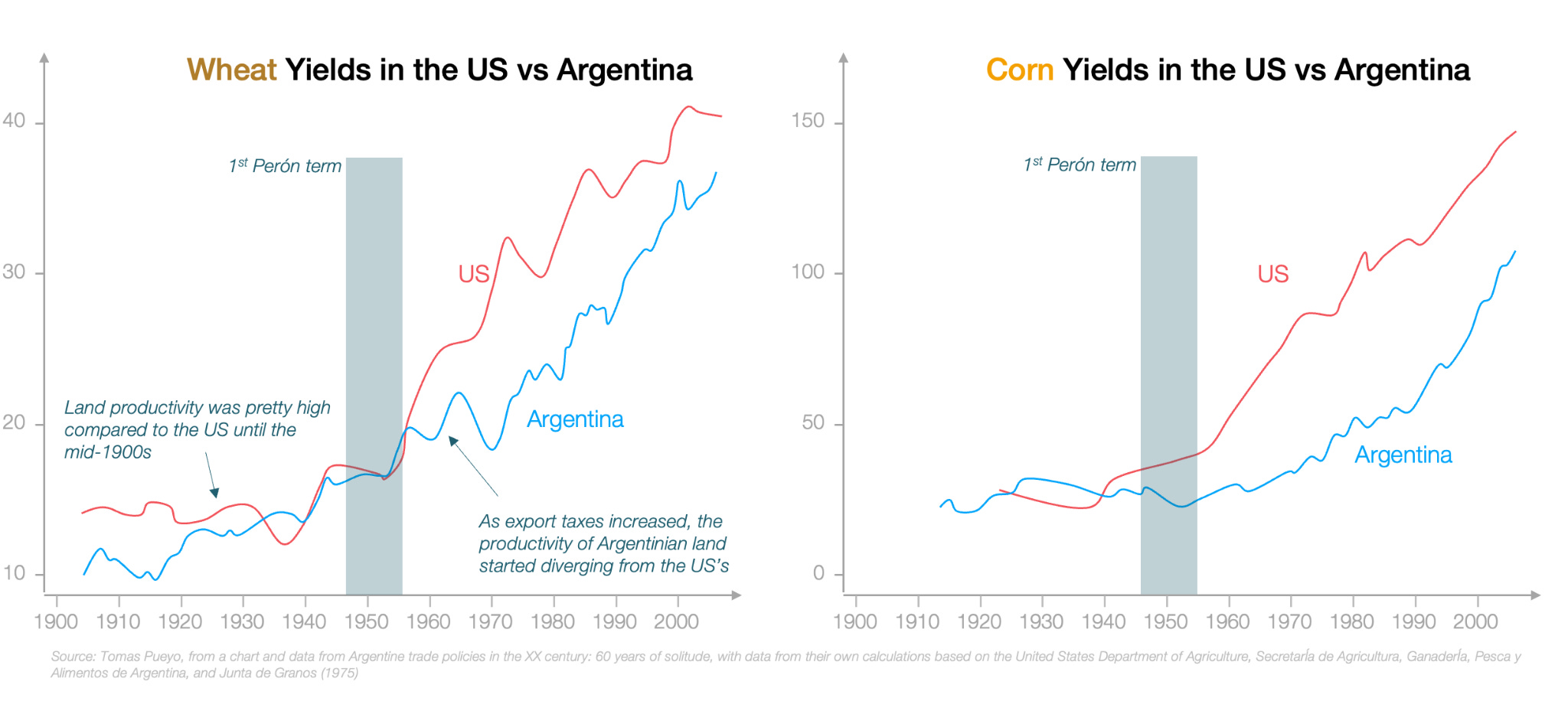 This reduces both production (and so exports), and investment. Indeed, Argentinian agriculture suffered from this, which we can see in the graph of wheat & corn productivity from before the export tax was introduced during Peron’s first term, when yields were still competitive: