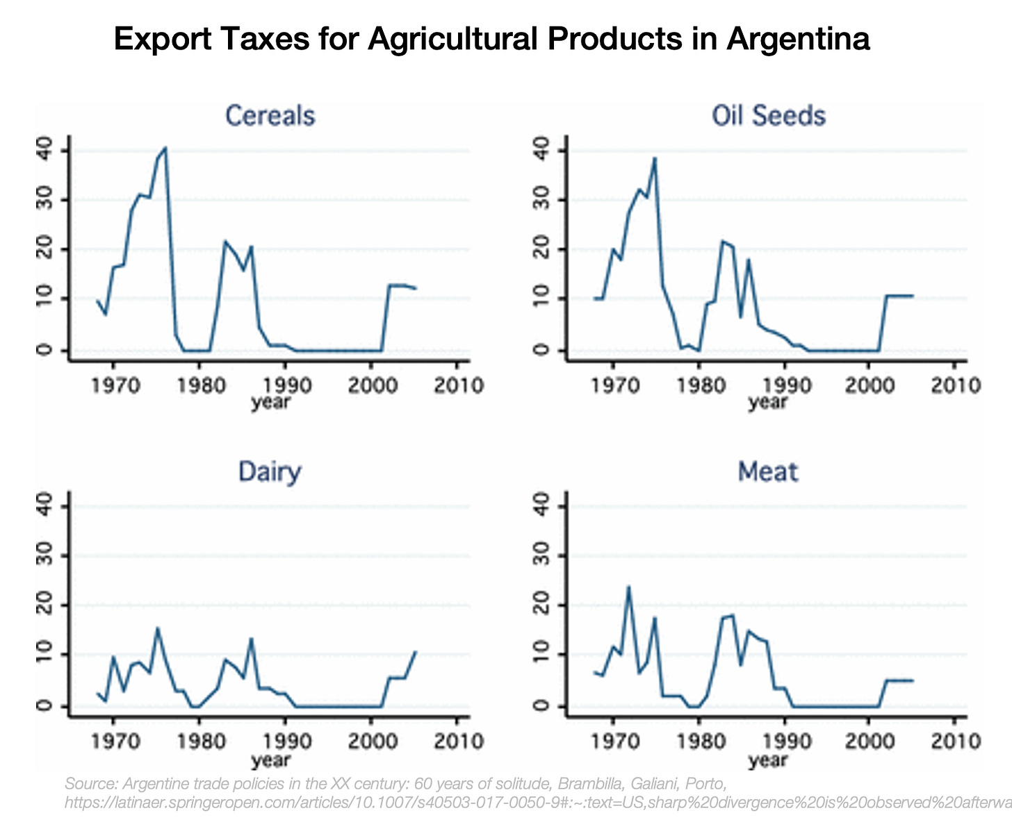 Instead, Argentina simply taxed agricultural exports. For example, the IAPI (Instituto Argentino de Promoción del Intercambio) had a monopsony on agricultural exports (it was the sole buyer by law).