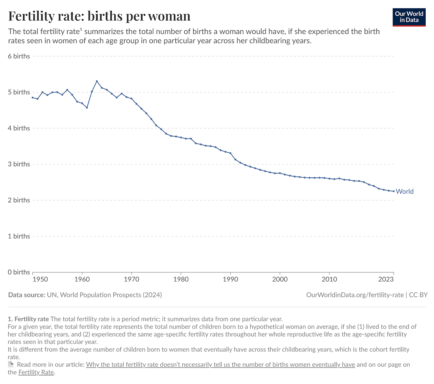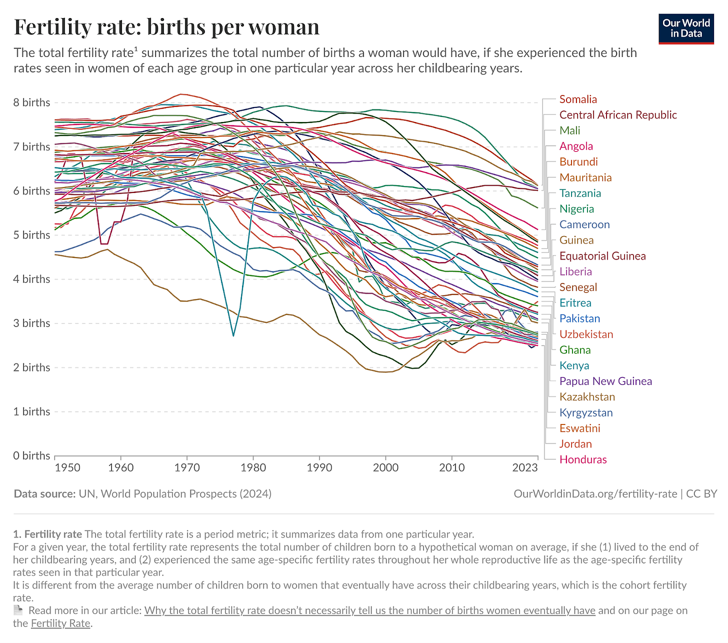 We’re at 2.3 children per woman, closing in on 2.1, because most countries’ fertility rate is going down, including that of virtually all high-fertility countries:1