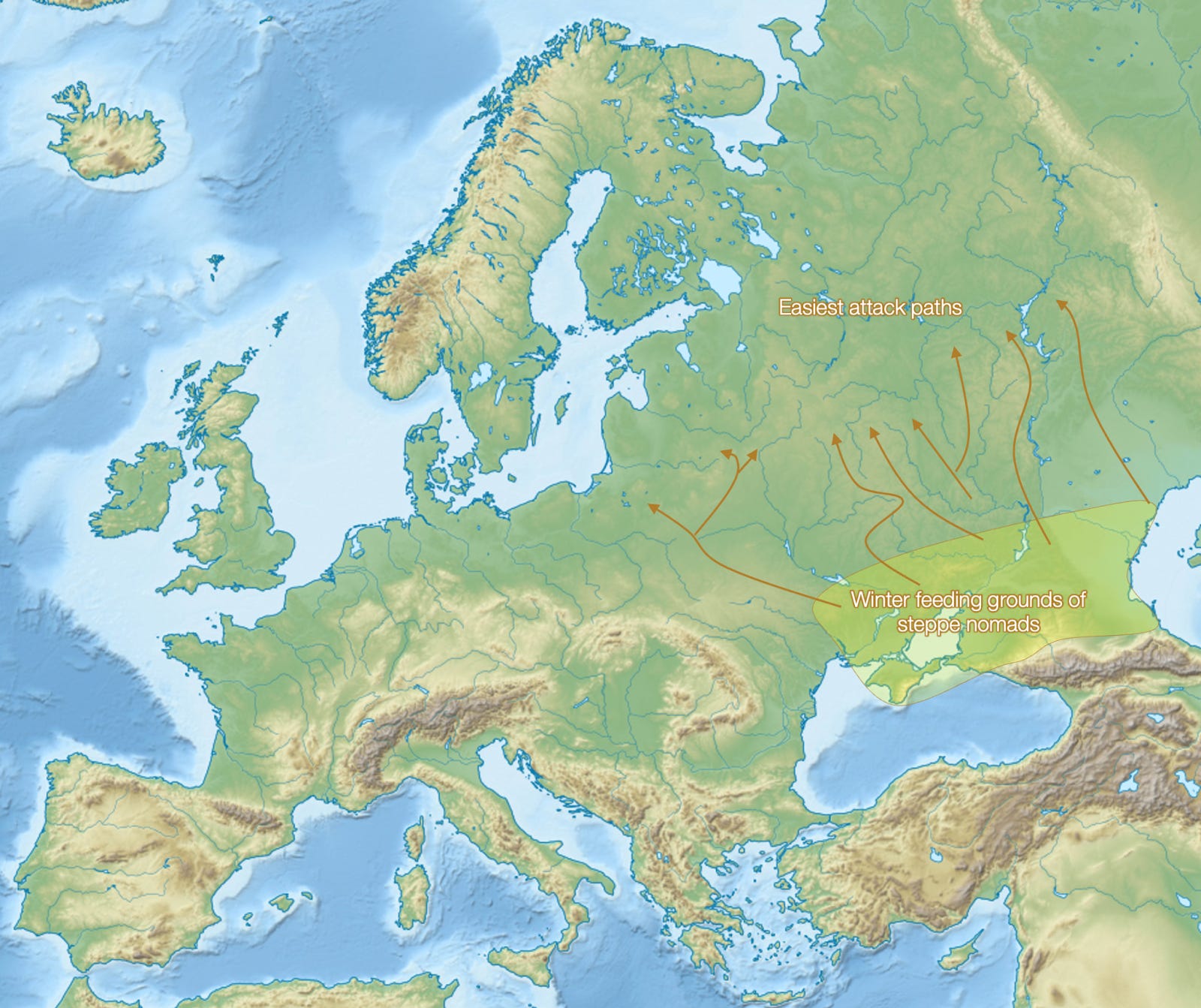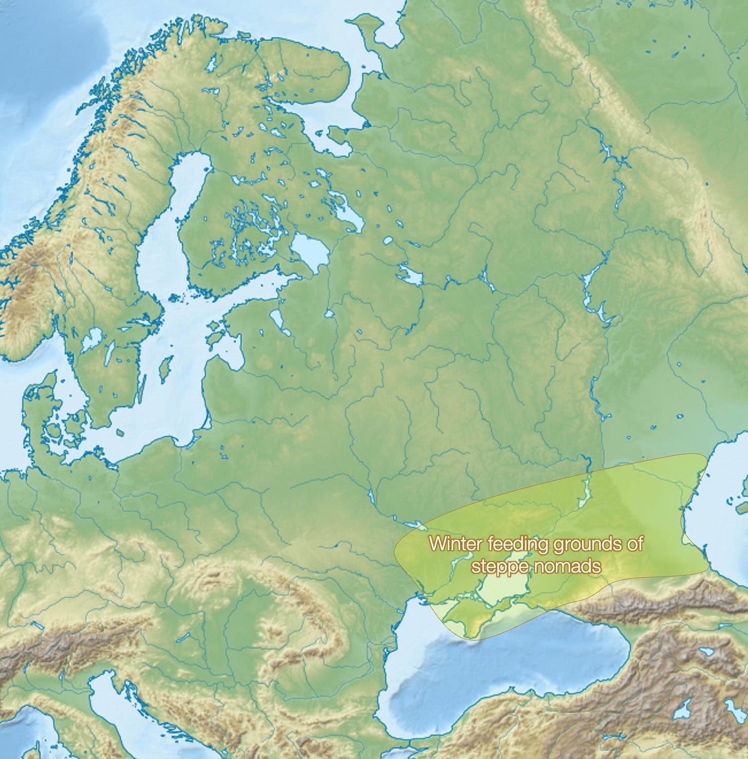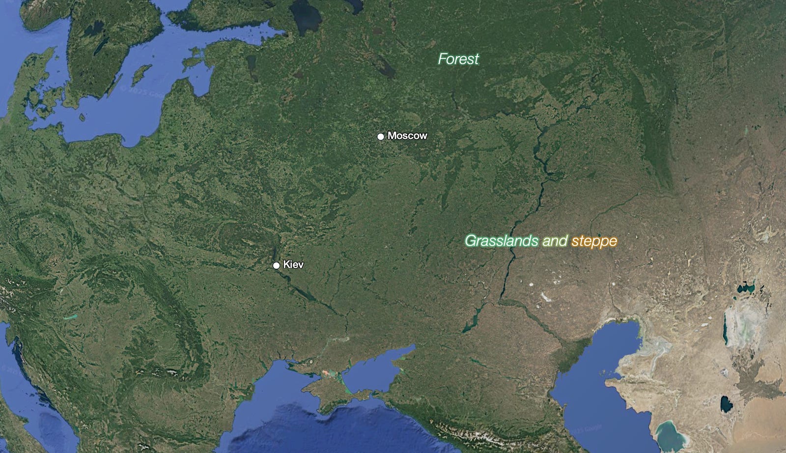 One point that I would add is that the highly productive soil of modern-day Ukraine and southern Russia could not be plowed before the invention of the steel plow. This made dense populations centers almost impossible to evolve in the Temperate Forest biome. This gave the Herding societies free rein over the region. The invention of the steel plow opened up some of the world’s most productive agricultural regions, including the American Great Plains, the Russian/Ukranian steppe, and the Argentine Pampas.